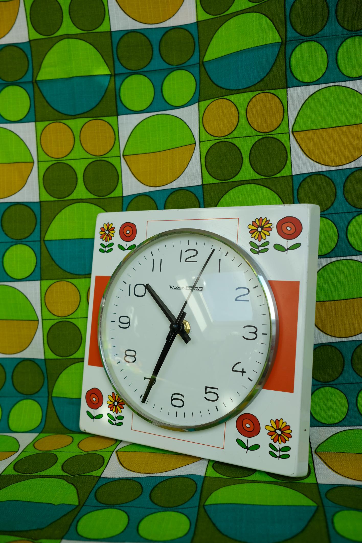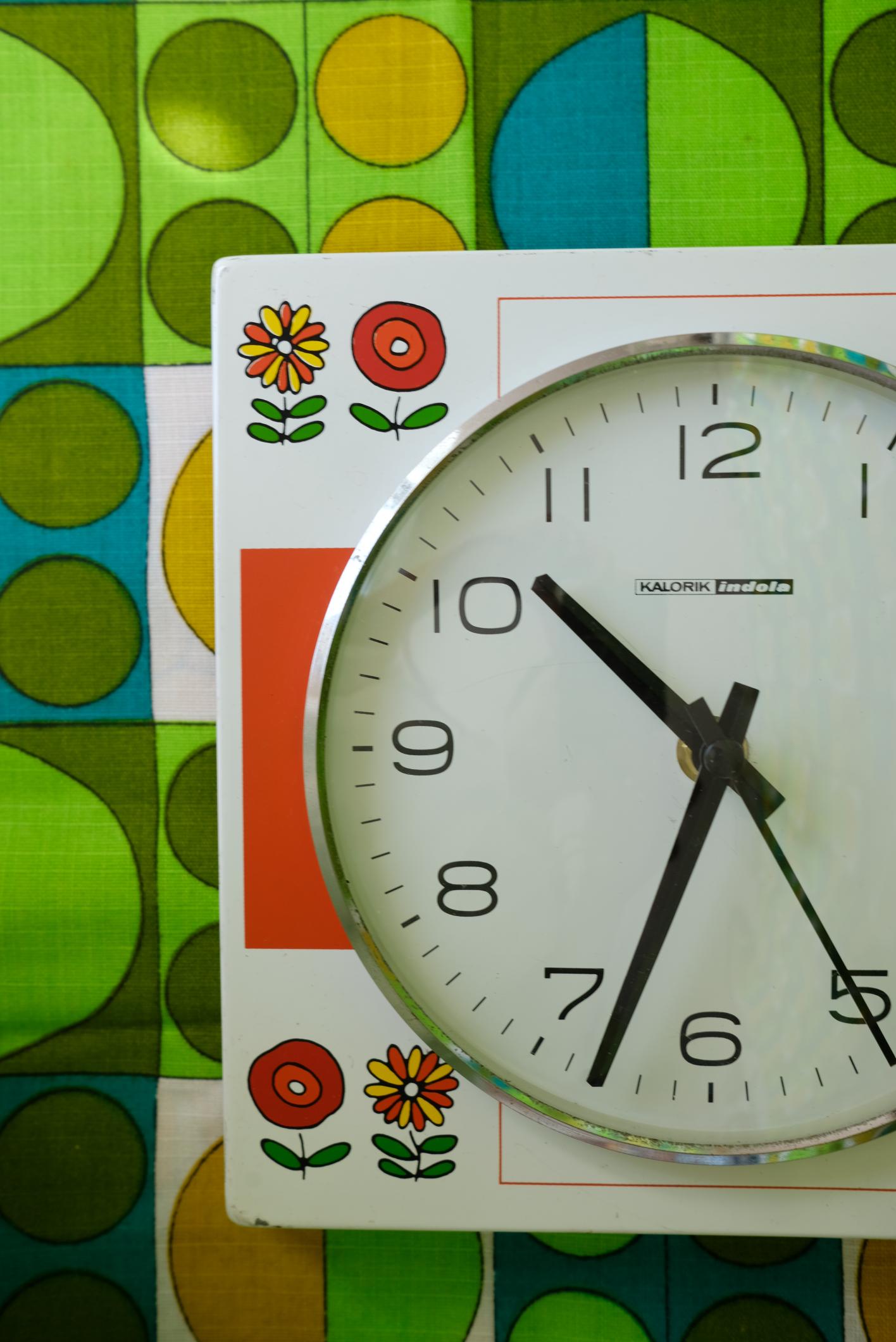 Horloge Murale Kalorik Indola en verre légèrement bombé et métal, elle est en bon état et mesure 19.5 cm de côté.