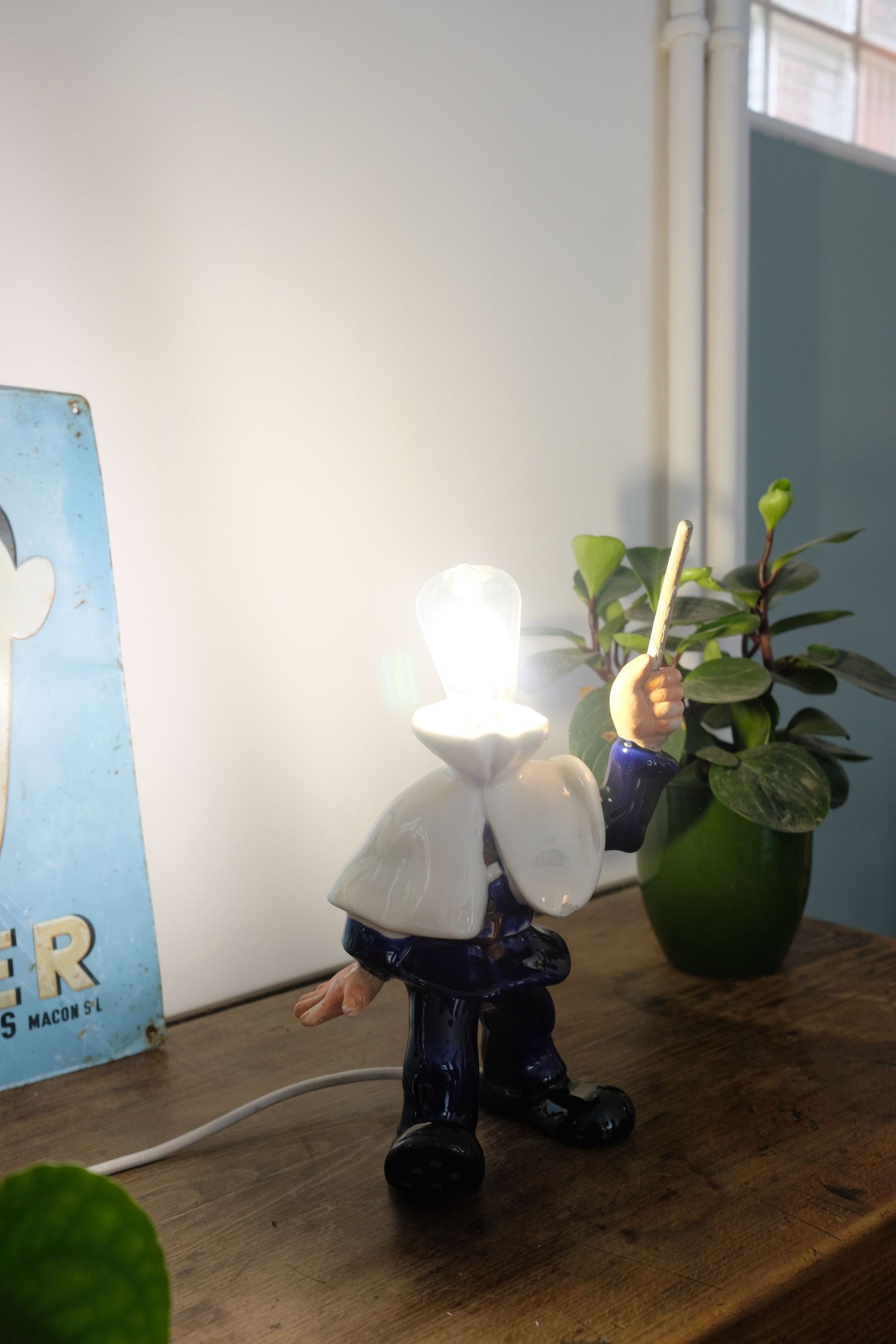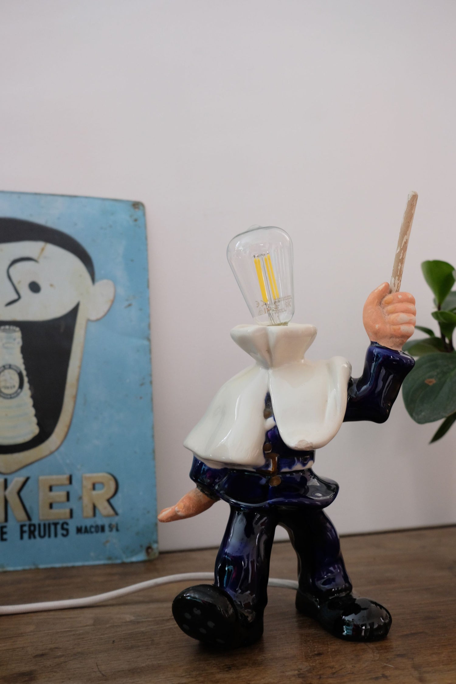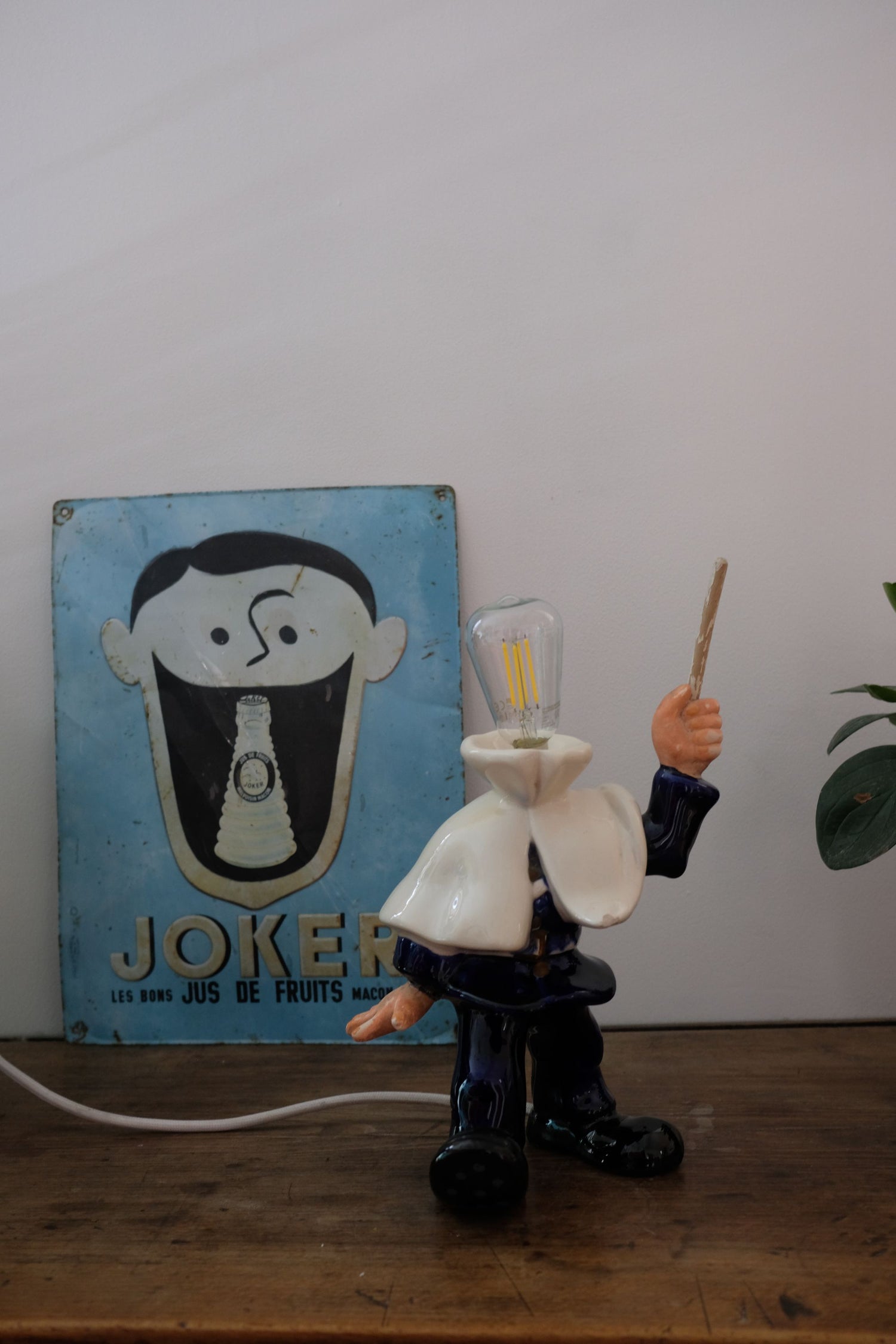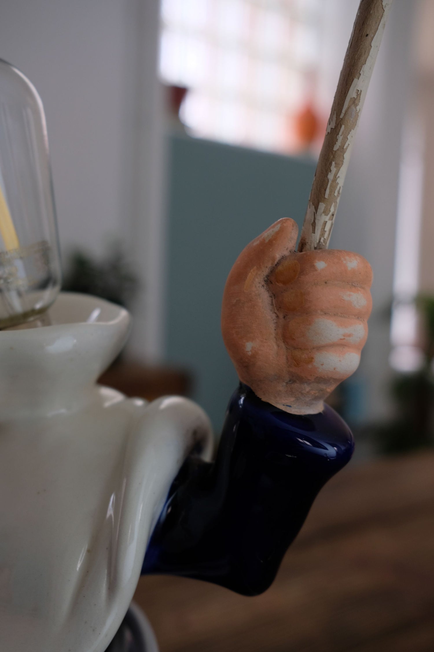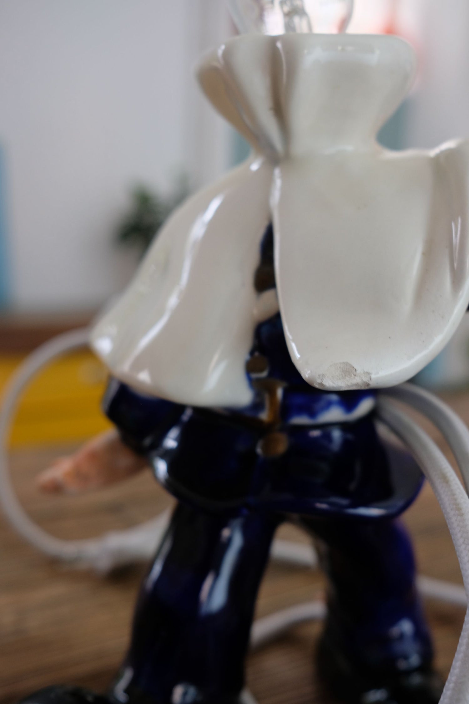 Lampe ancienne en céramique, système électrique refait à neuf. Le temps a laissé quelques traces sur ce curieux objet, qui n'en reste pas moins une vraie pépite.