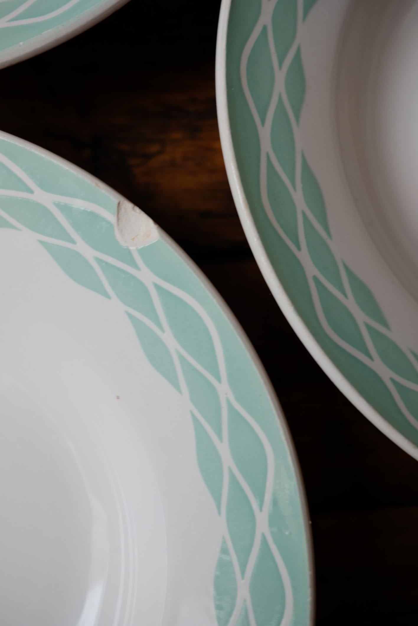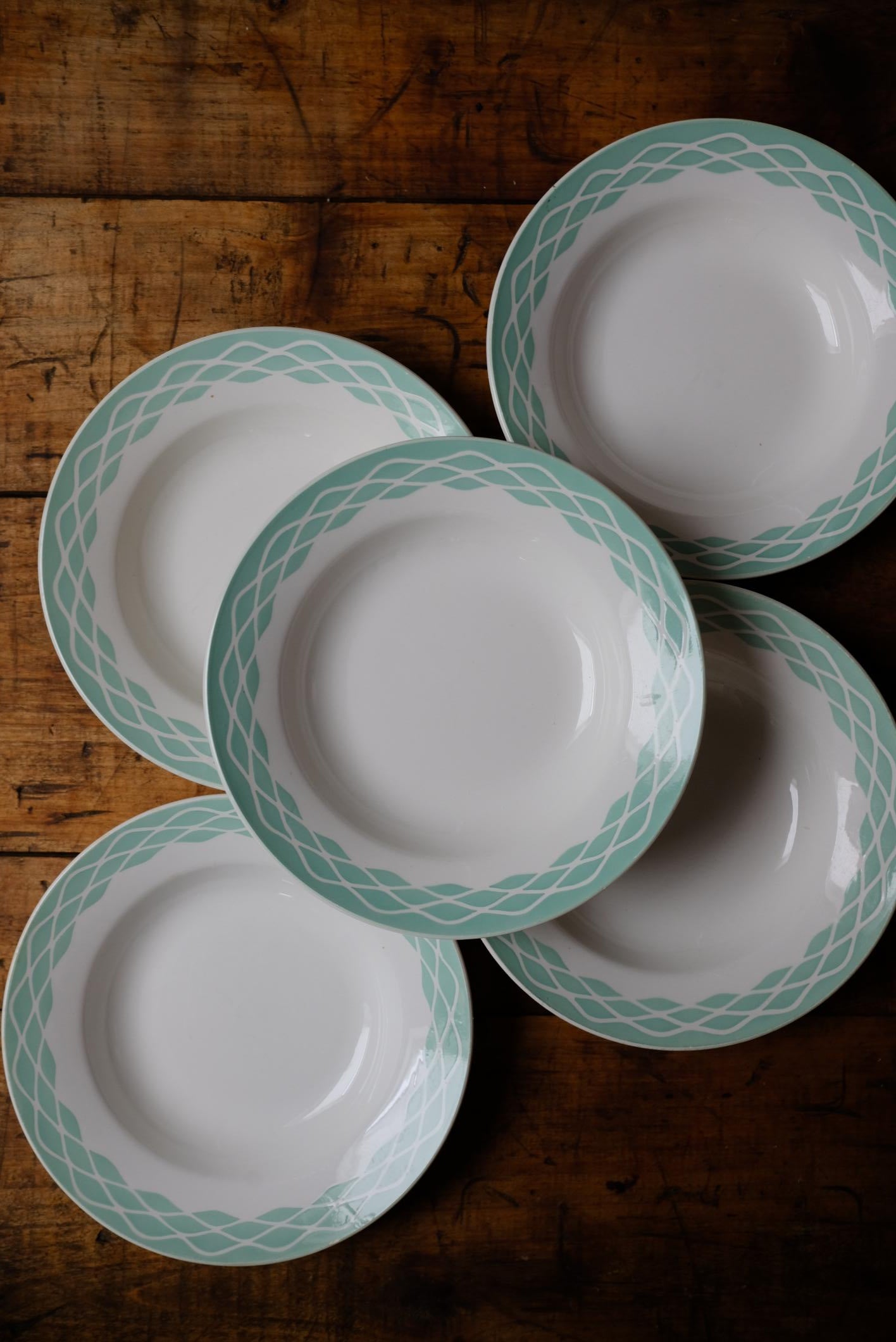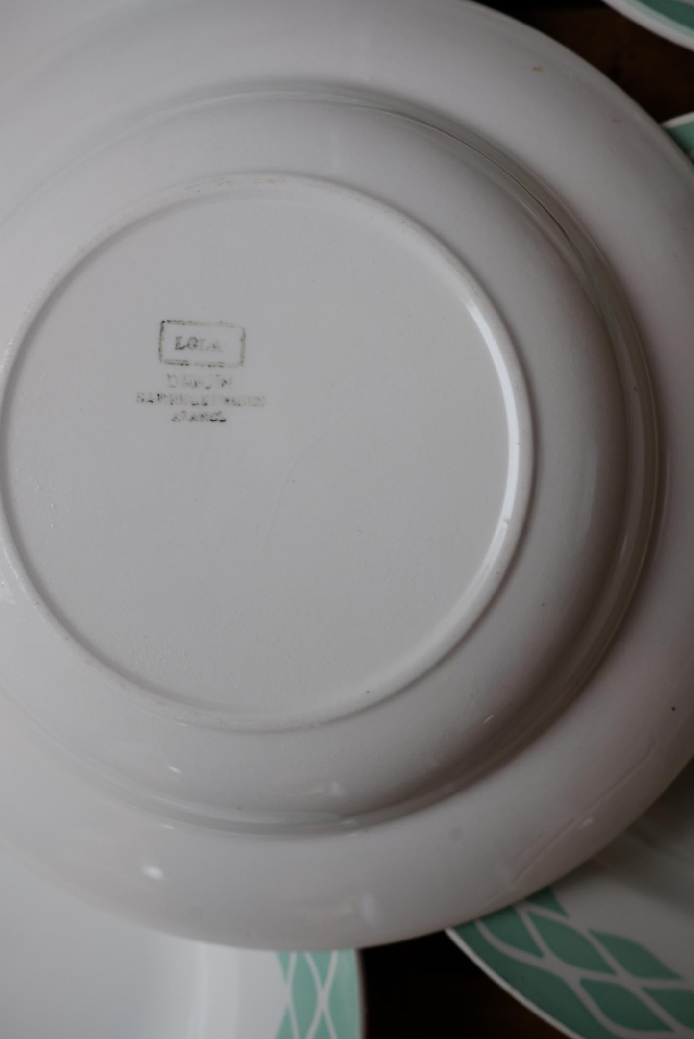 Lot de cinq assiettes Digoin Sarreguemines, modèle Lola, couleur mint. Elles sont en bon état malgré un poc à constater en photos. Elles mesurent 22.5 cm de diamètre.