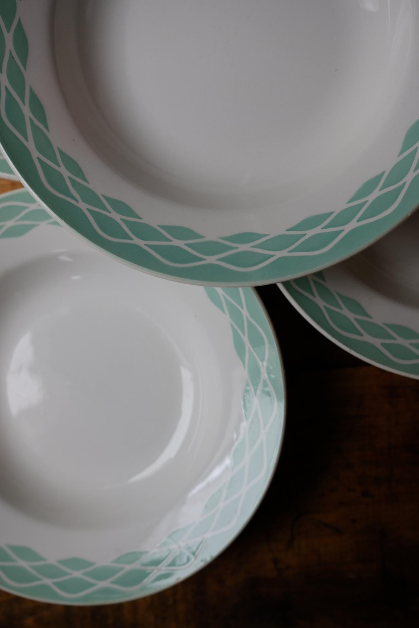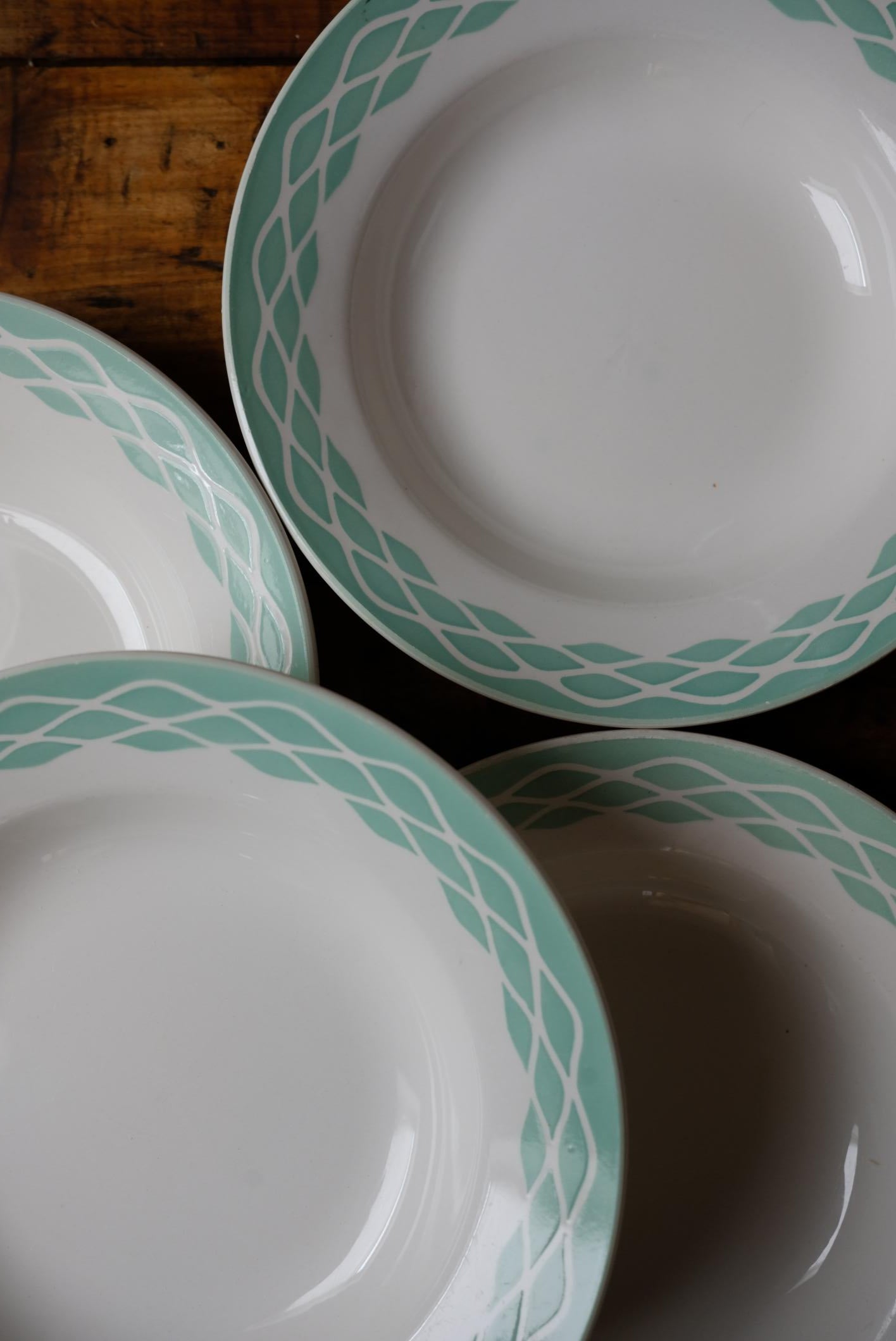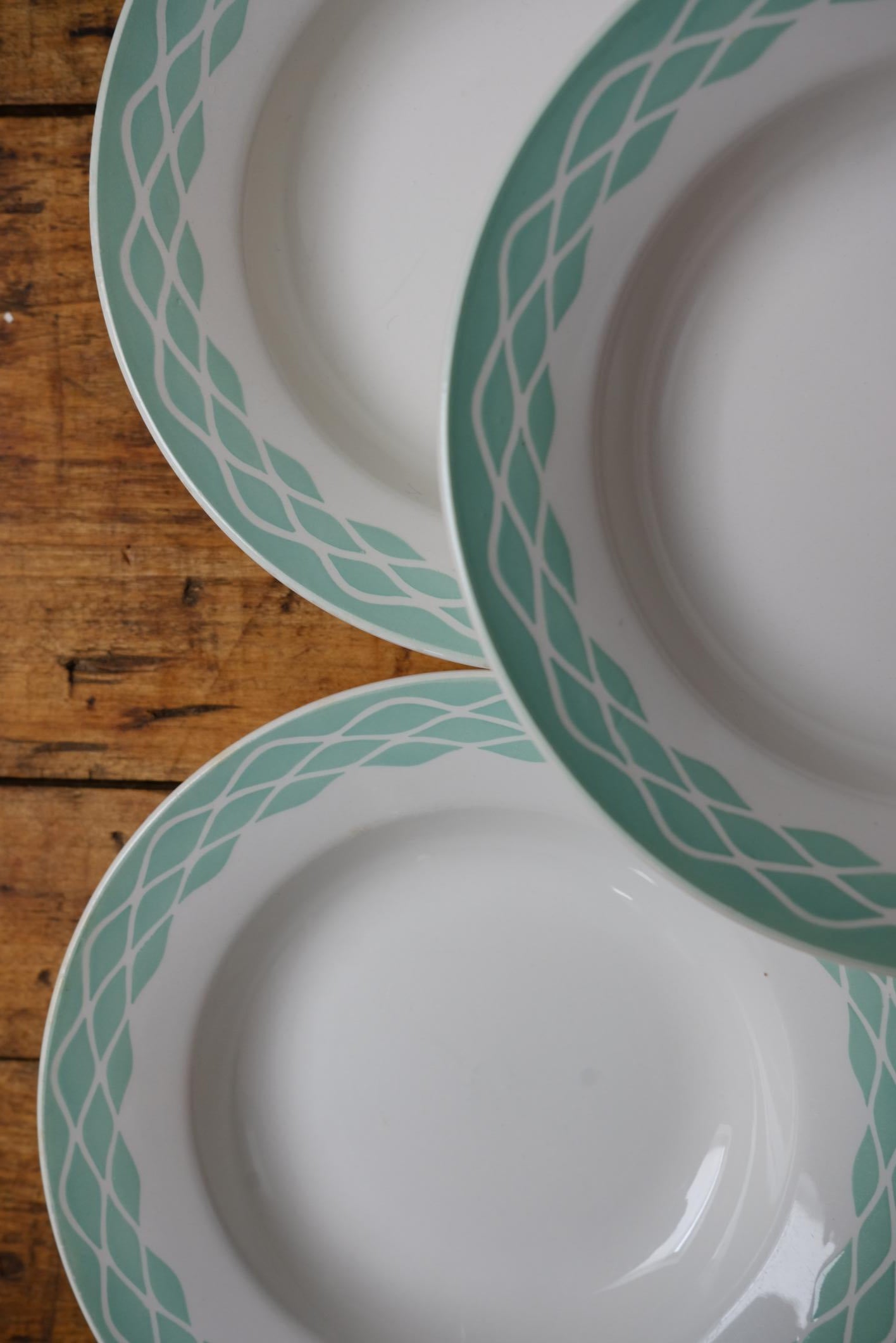Lot de cinq assiettes Digoin Sarreguemines, modèle Lola, couleur mint. Elles sont en bon état malgré un poc à constater en photos. Elles mesurent 22.5 cm de diamètre.