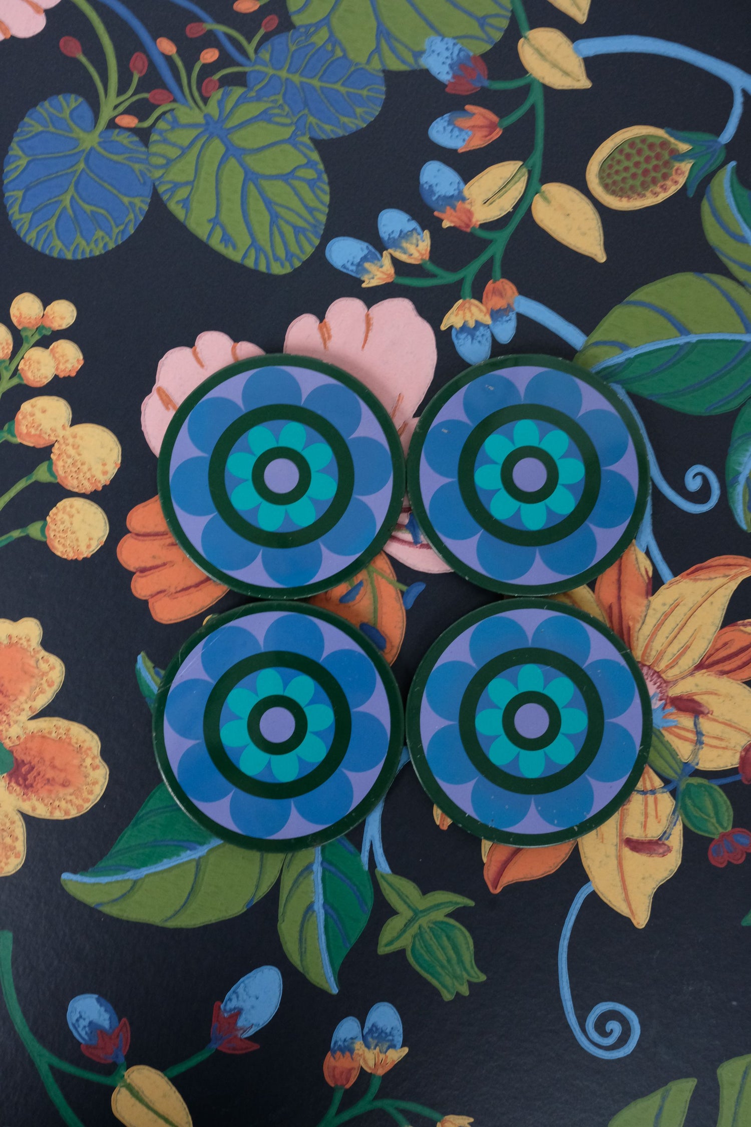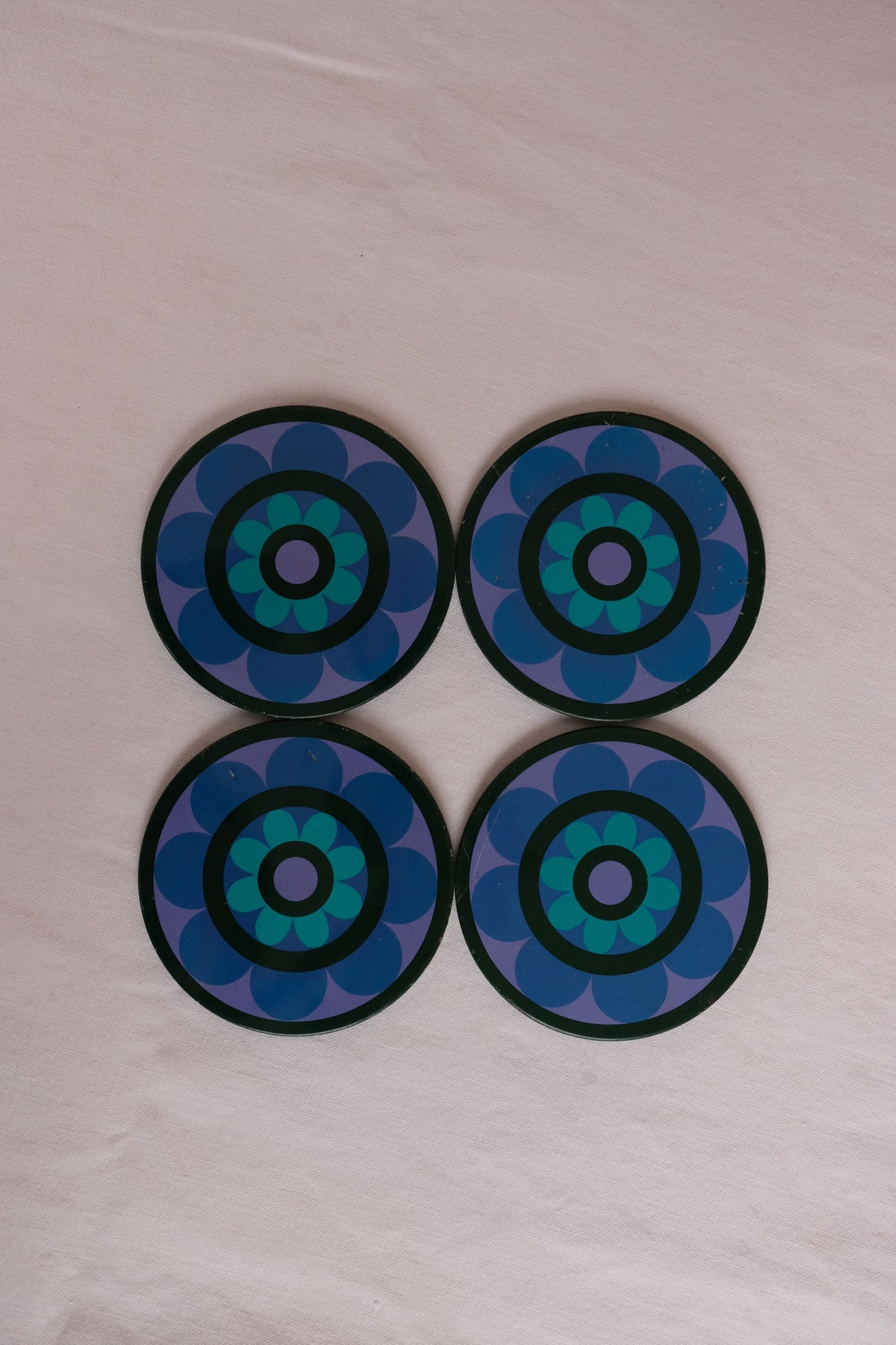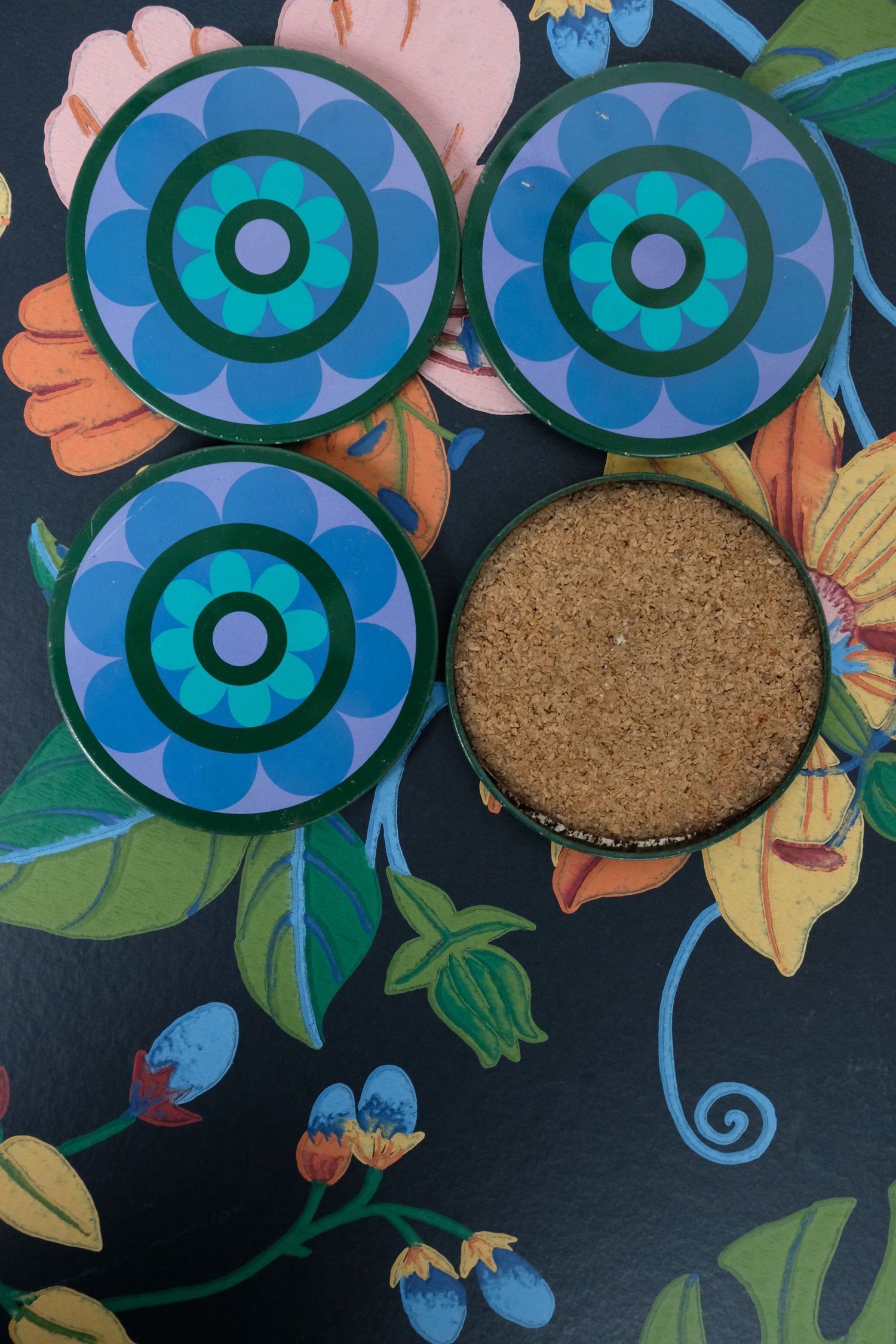 Dessous de verre en métal et liège, ils présentent quelques rayures et mesurent 9.3 cm de diamètre.