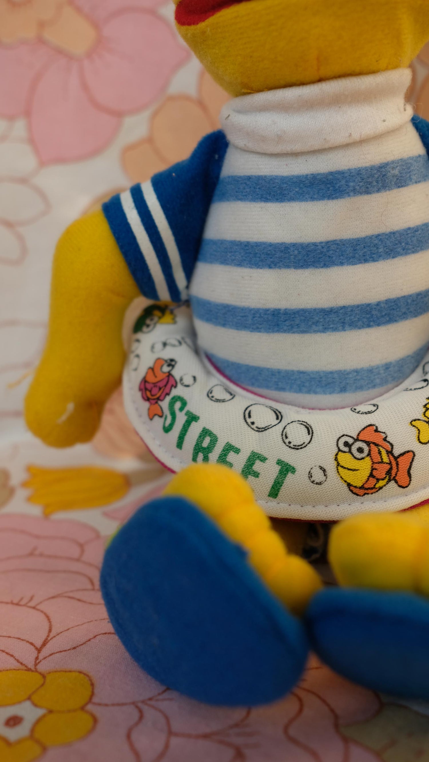 Peluche Bert de sésame street va à la plage; elle est en bon état.