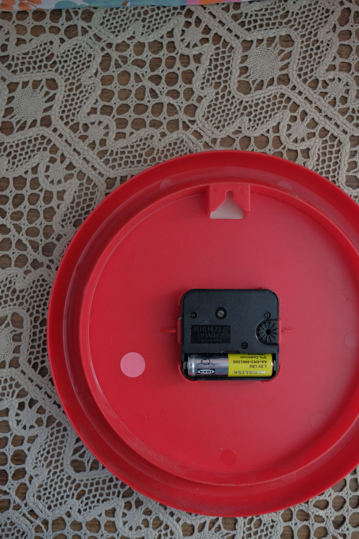 Horloge murale made in Germany, le "verre" (qui est en plastique) est un peu rayé, elle mesure 22 cm de diamètre.