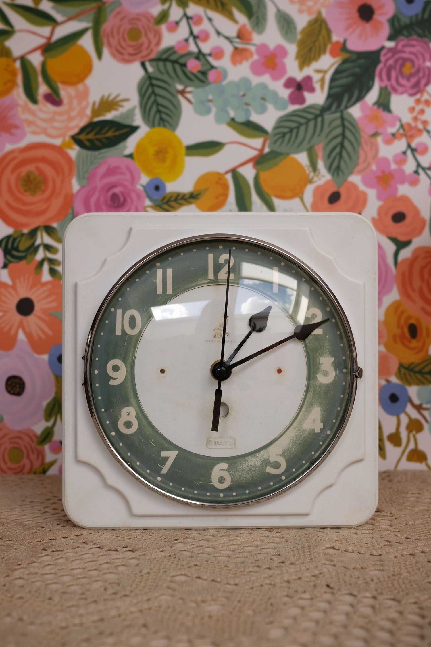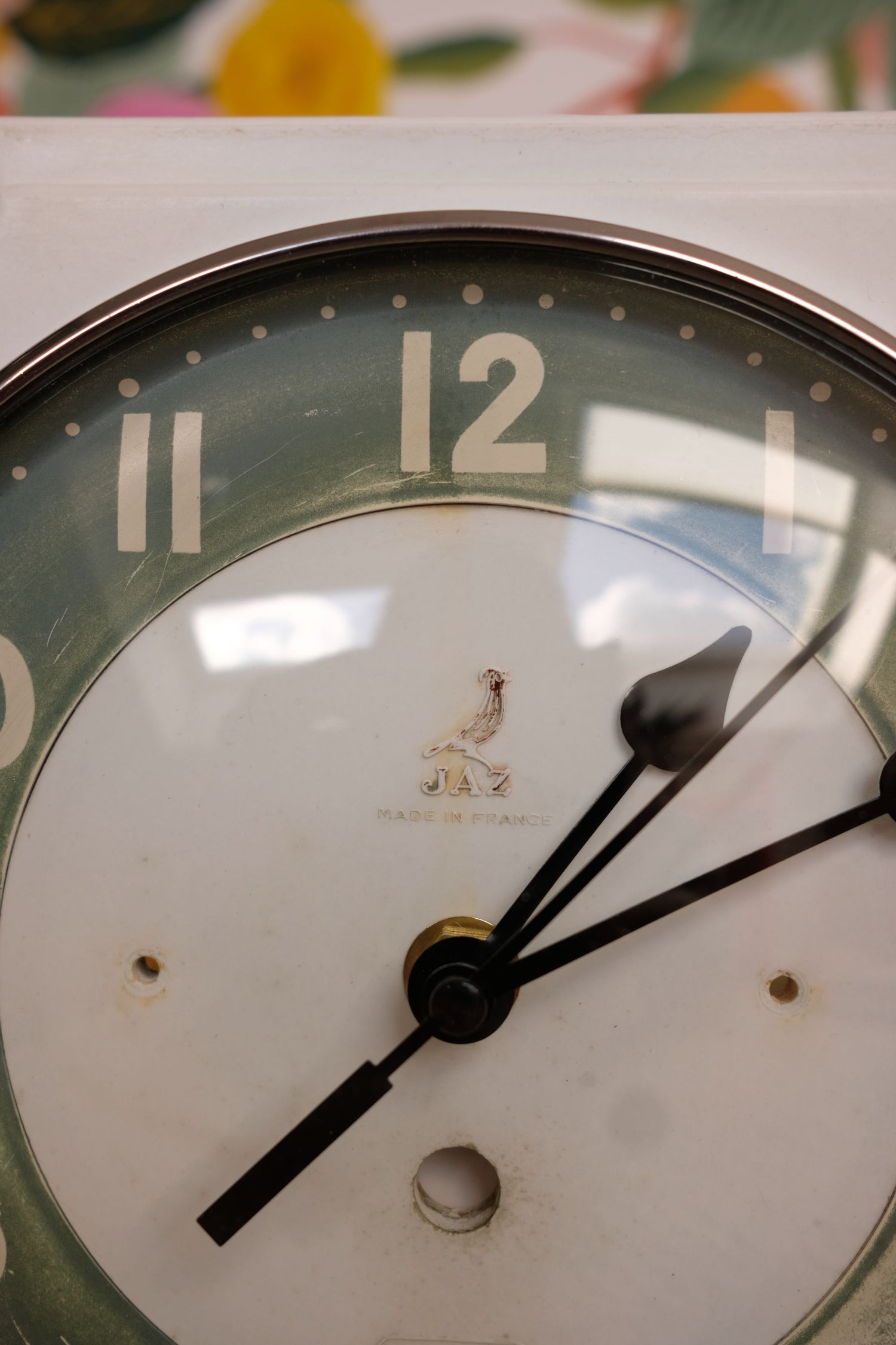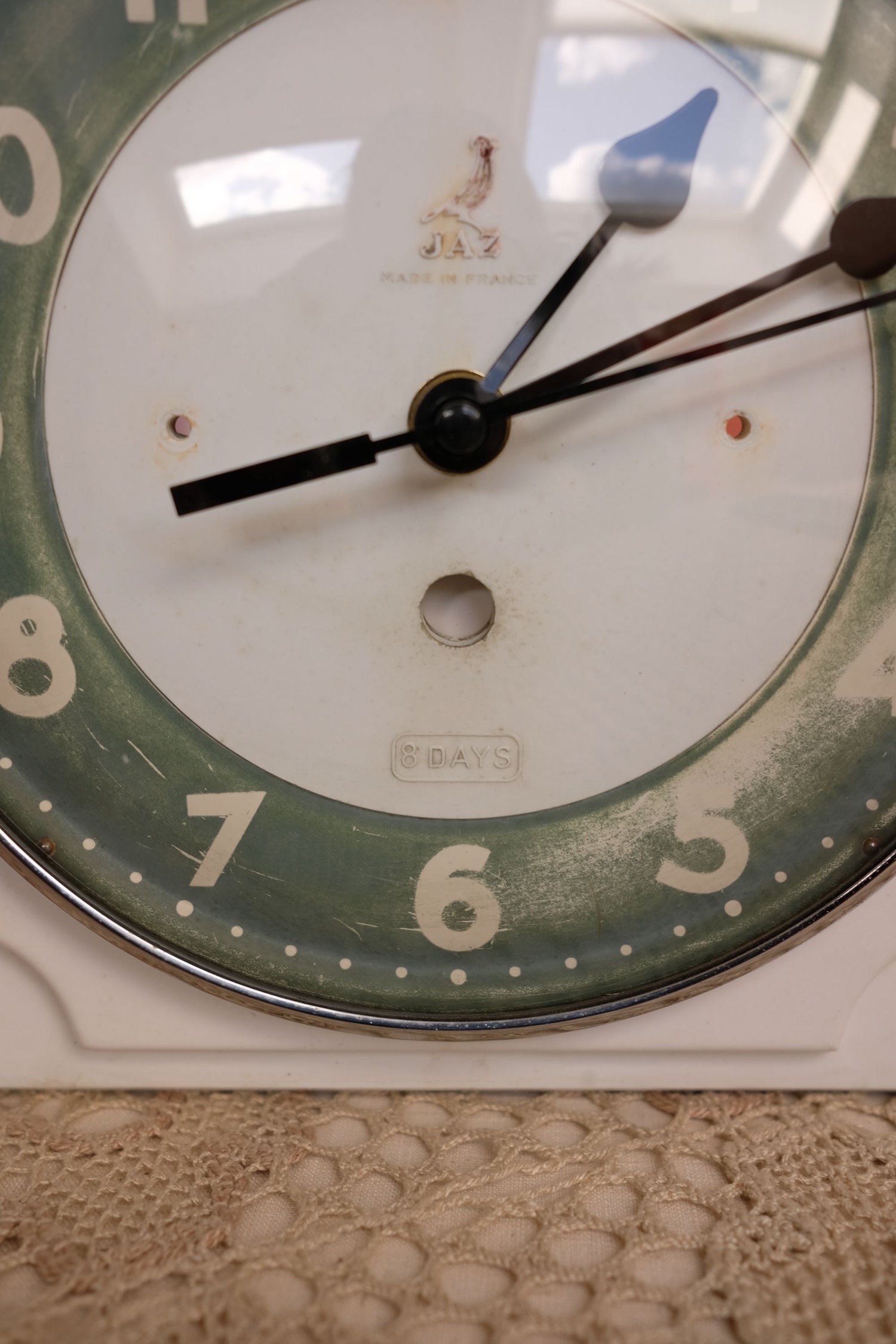 Pendule Jaz, mécanisme refait à neuf pas nos soins, verre bombé et cadre en plastique. Elle mesure 22x222 cm.