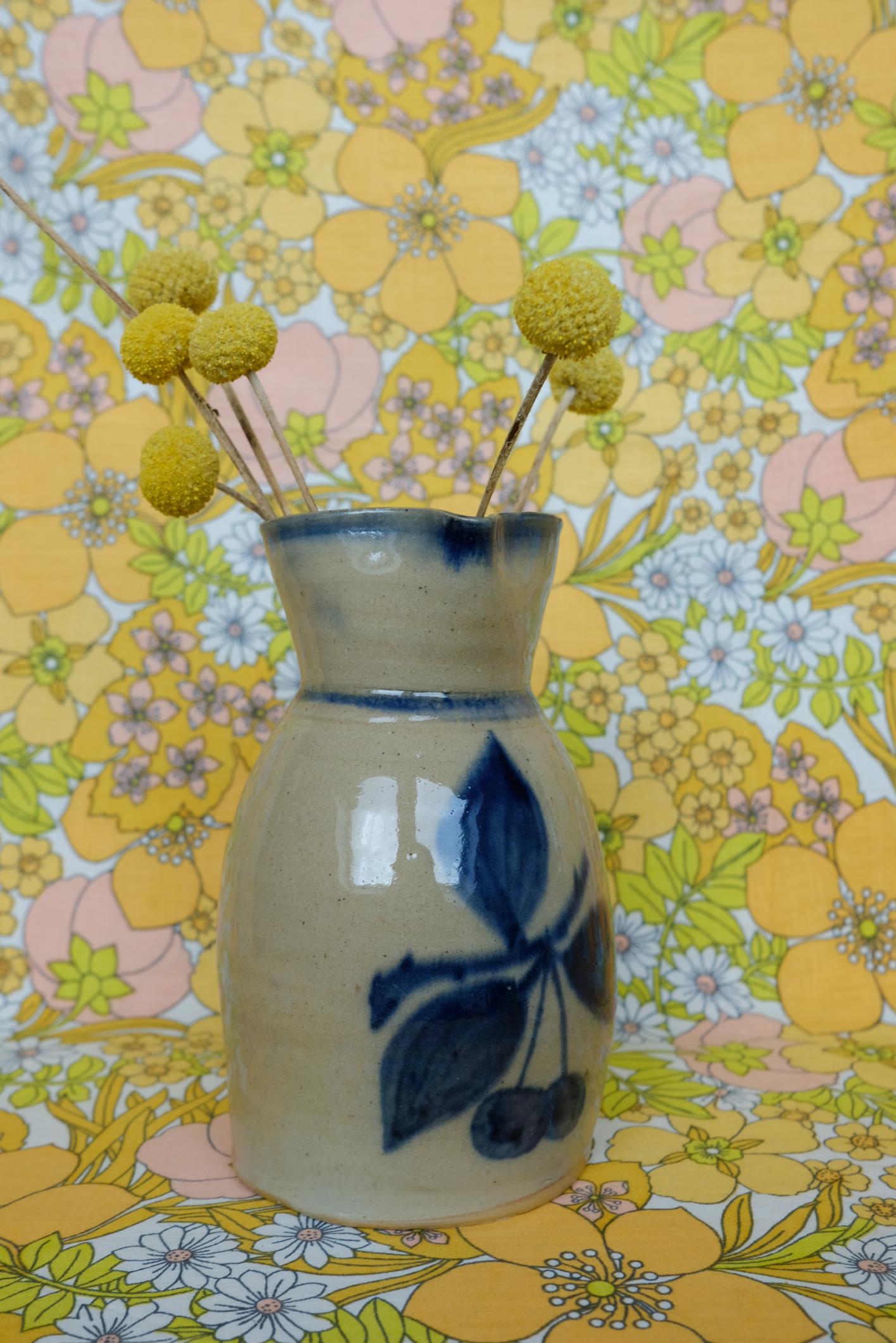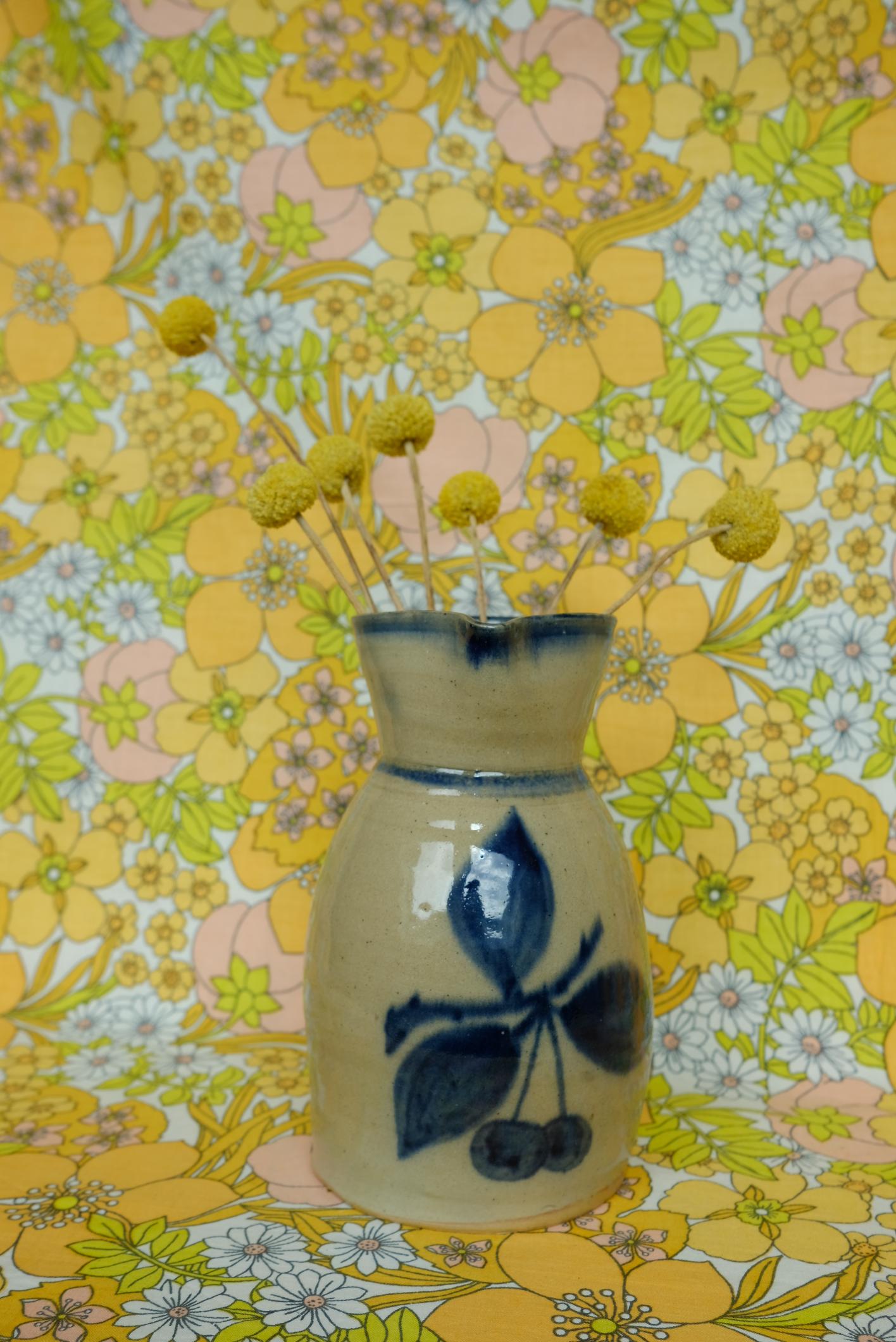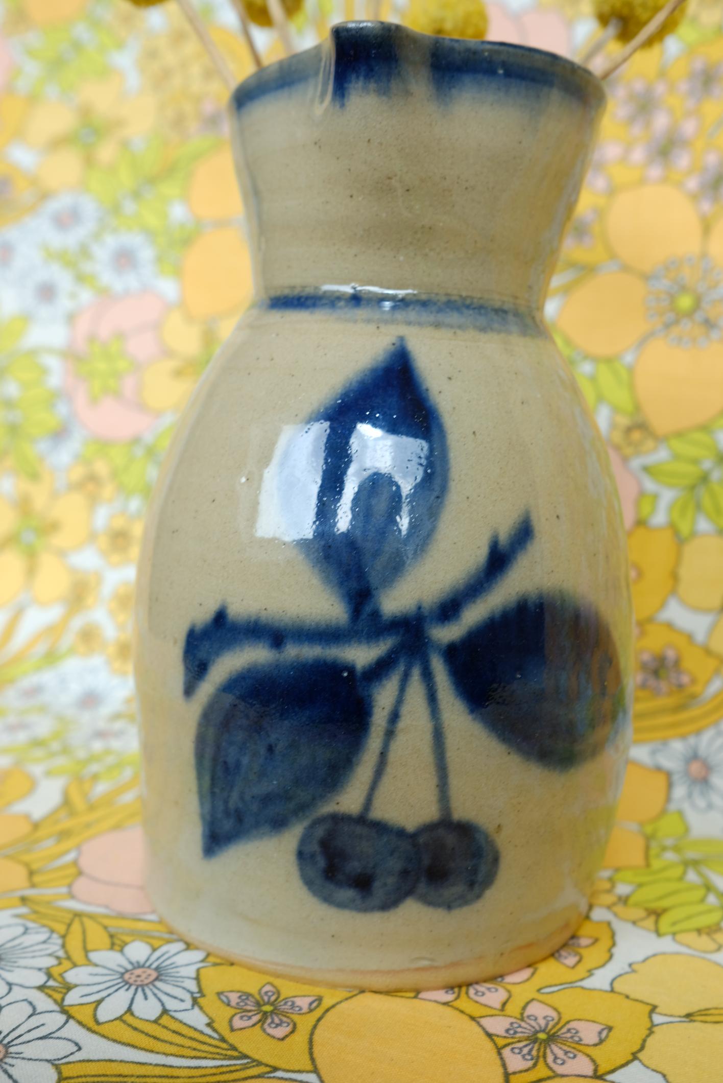 Pichet en grès vernissé motif cerises. Il est en très bon état et mesure19 cm.