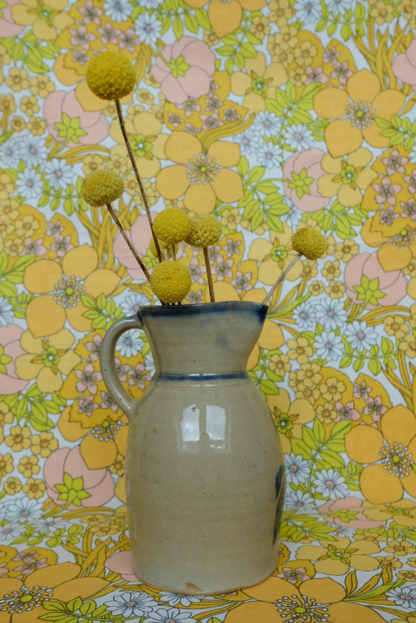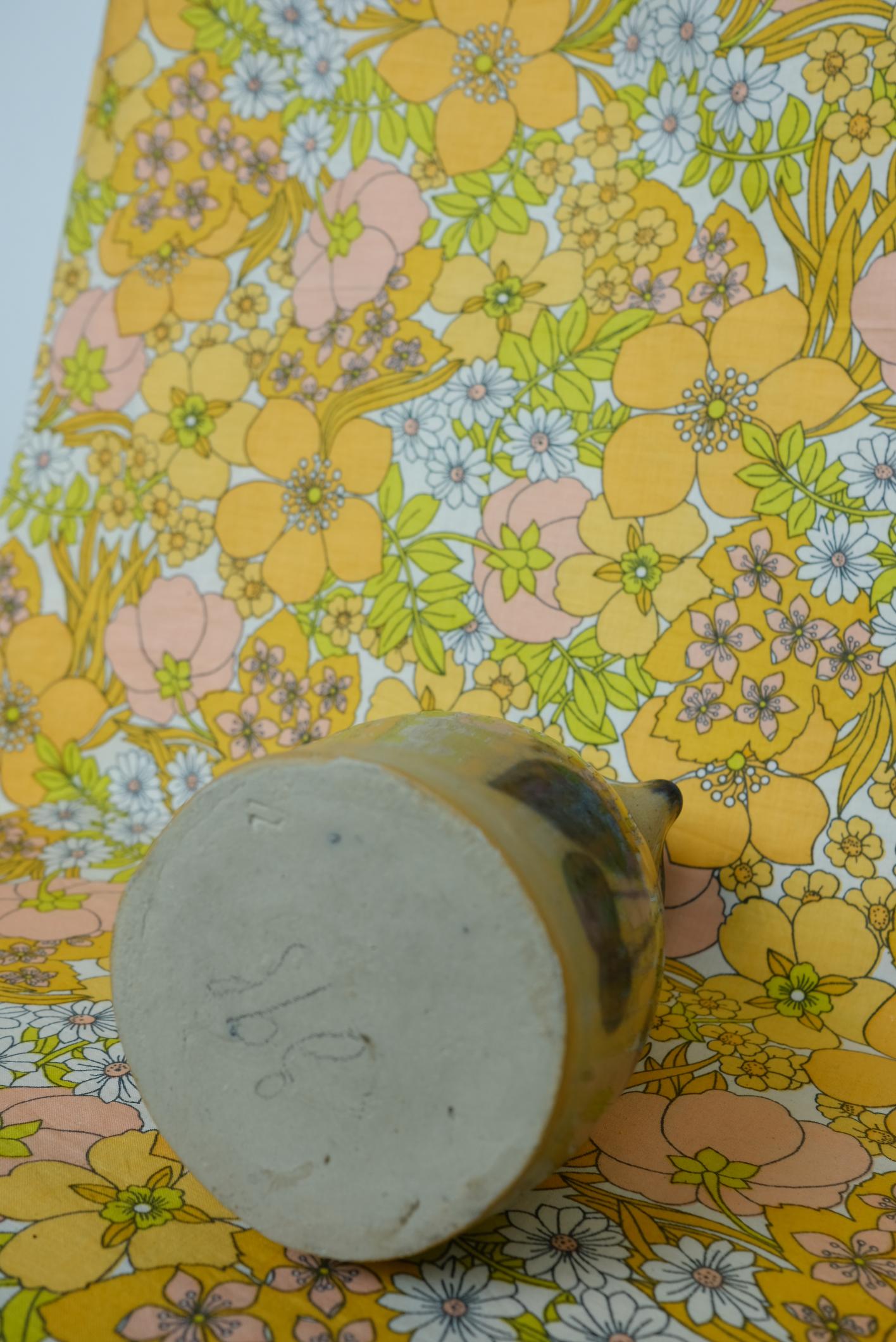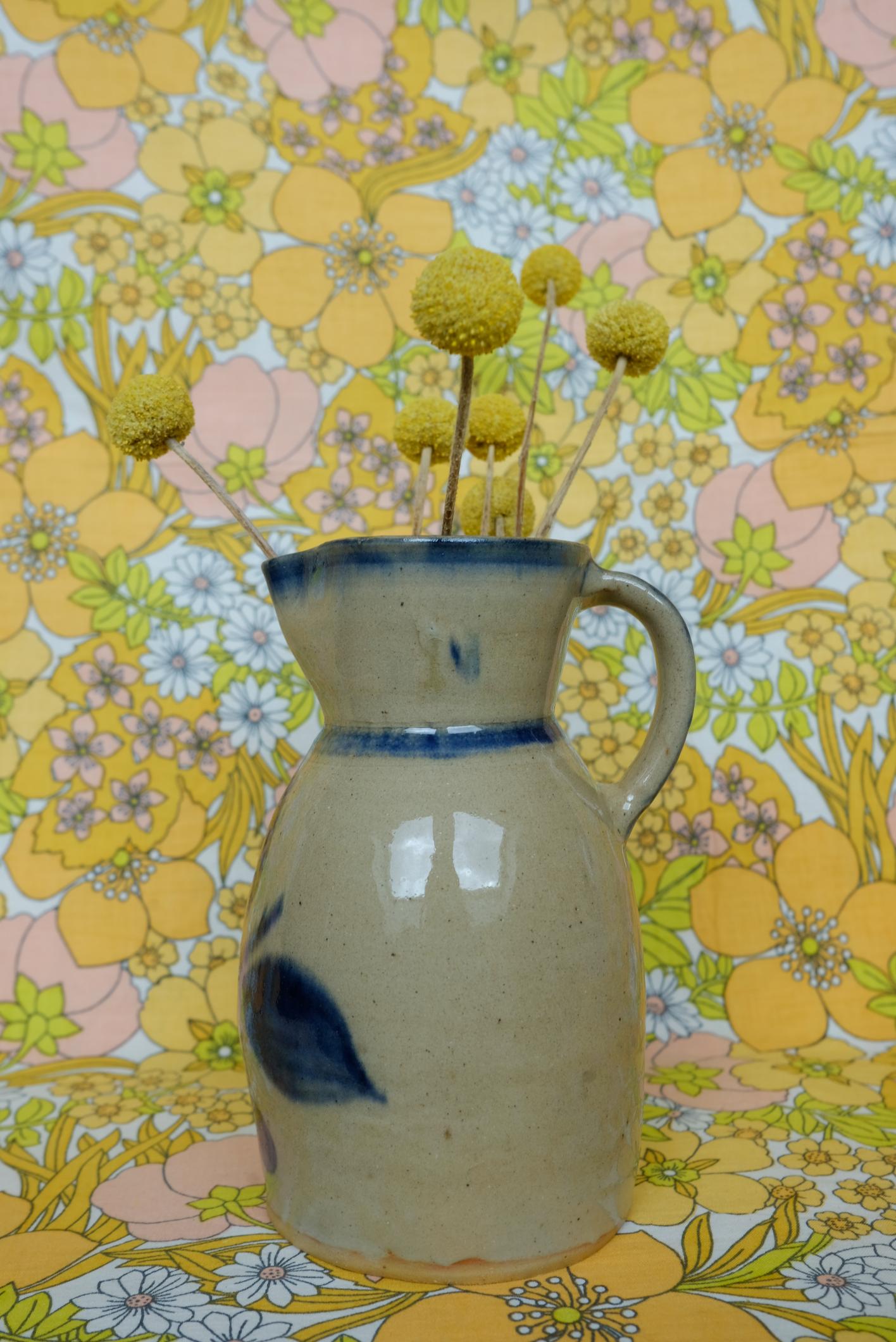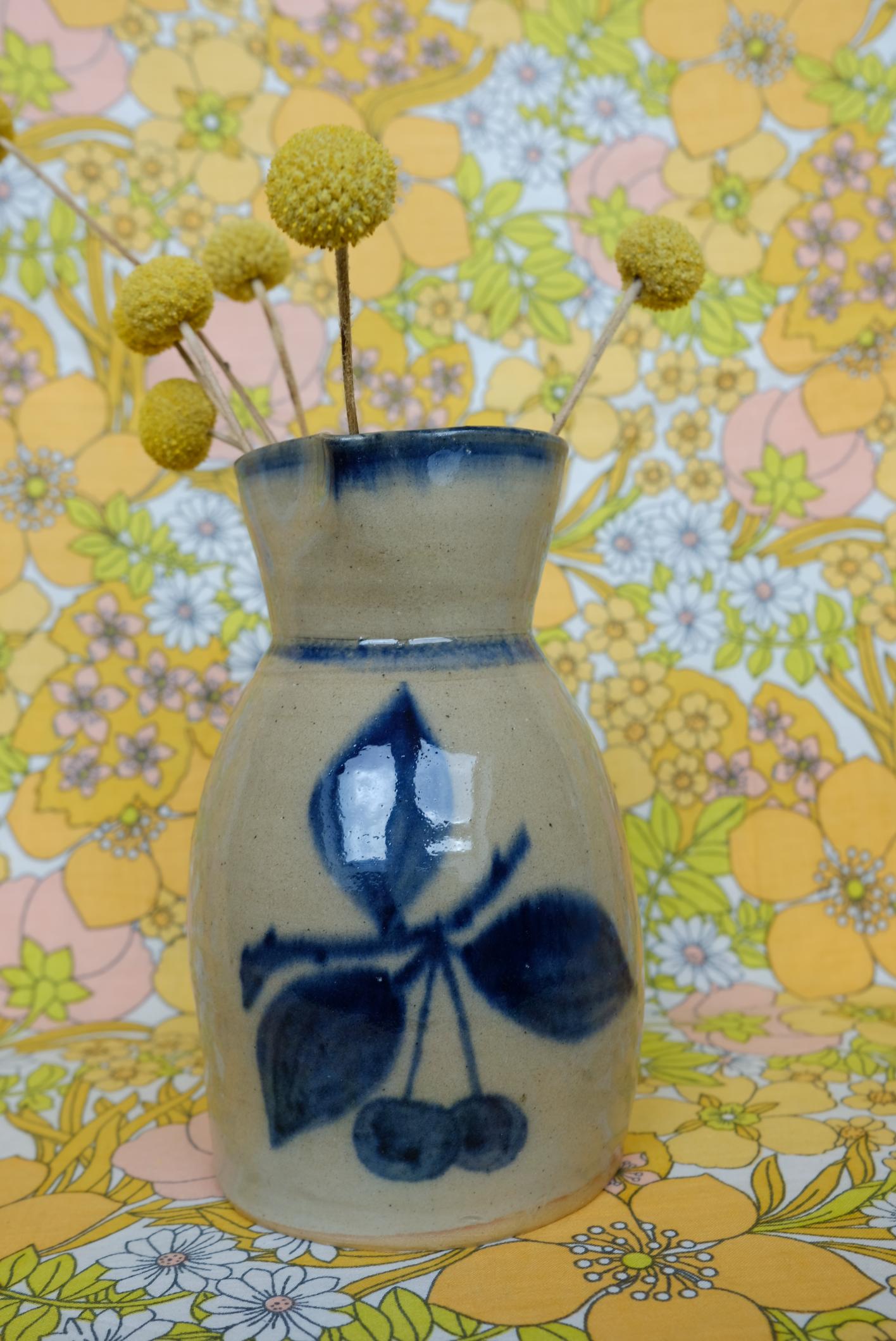 Pichet en grès vernissé motif cerises. Il est en très bon état et mesure19 cm.